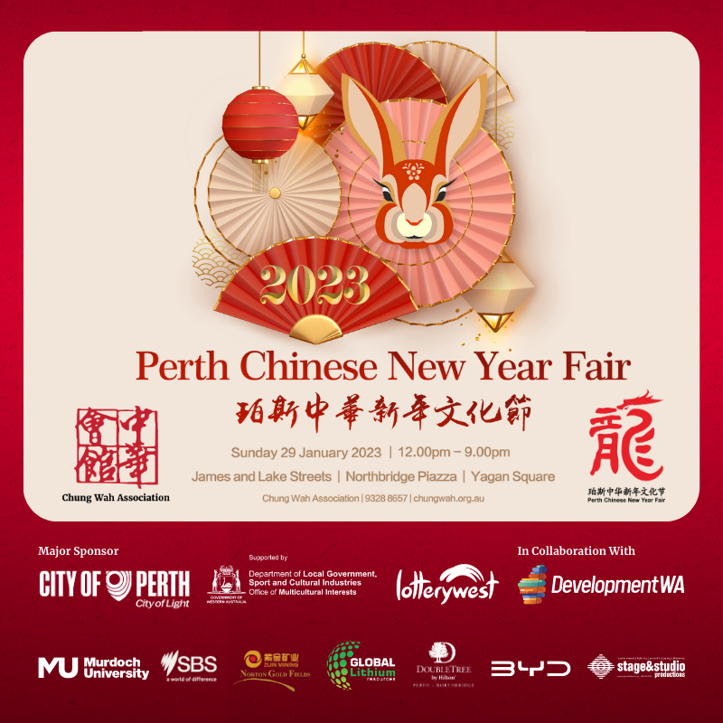 The Perth Chinese New Year Fair will be held on Sunday, 29 January 2023, celebrating the Lunar New Year of the Rabbit.